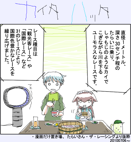 ・37枚目の看板絵 漫画だけ置き場より新作のたらいさんの漫画から1コマ 今年もまた夏が来ましたね ・漫画だけ置き場に漫画を1つ更新しました・ 「たらい・ザ・レーシング」 http://island.geocities.jp/yasakajinjya02/comic/tare.html たまたまNHKで流れていたニュースからチョロチョロっと描き始めたのが始まりの一品です これからの季節、 水辺の事故には気をつけたいものですね ・現在当サイトにおけるヤフーで構成されたページがグーグルブラウザ「クローム」で見ると文字化けを起こす現象があります なんでか調べてもサッパリお手上げ白旗状態につき、 クロームでご覧になられる方はよきアドバイスかそのまま諦めてご覧くださいませ 大した事は書いてないので大丈夫 心配はいりませんッ ■ 7月! 夏ですなぁ・・・グッタリ でも暑くて忙しいと俄然がんばりたくなるのも不思議なもので、 そこが夏の良い所なのやもしれません 皆様におかれましては寝冷え、 夏風邪、 その他もろもろお気をつけくださいませといったところで、 また次回の更新までごきげんようさようなら |